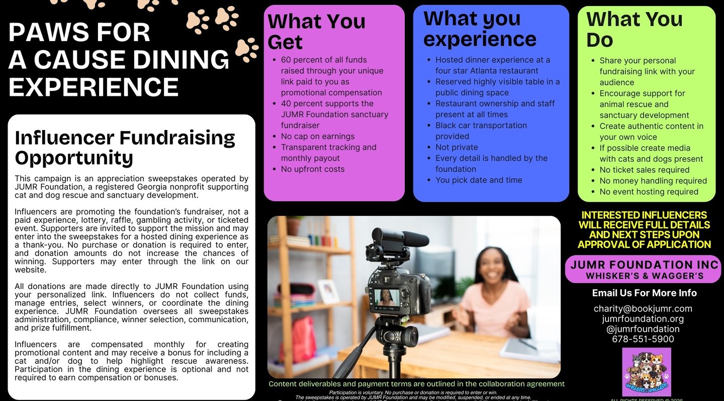 JUMR Foundation Inc. is a newly formed Georgia nonprofit dedicated to reducing pet abandonment and creating safe pathways to rehoming and long term sanctuary care for cats and dogs.